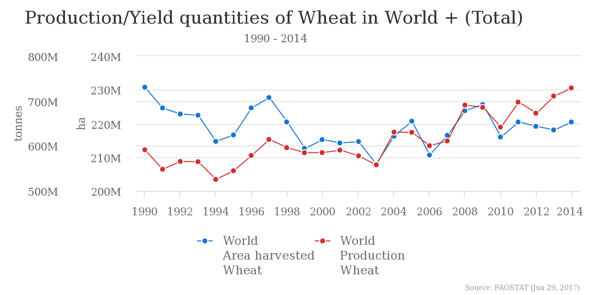 Bananas: The banana production is led by far by India, in 2014 the country produced 29MT. Others important producers are China (11.7MT), Philippines (8.8MT), Brazil (6.9MT), and Indonesia (5.9MT).