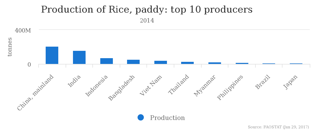 Rice (paddy): in 2014 China produced 206 million tons (MT) of rice, India 157MT, Indonesia 70MT, Bangladesh 52MT, and Vietnam 44MT. In 2014 Asia produced 90.8% of the world’s rice.