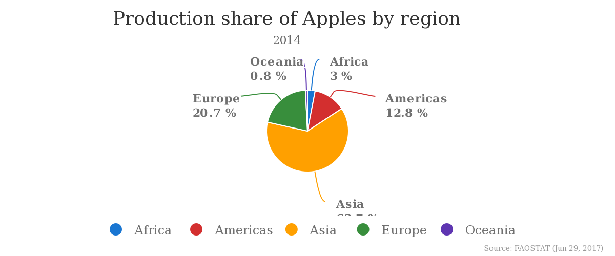 Apples: in 2014, China produced 40MT of apples, US 5MT, Poland 3MT, India 2.4MT, and Turkey 2.4MT.